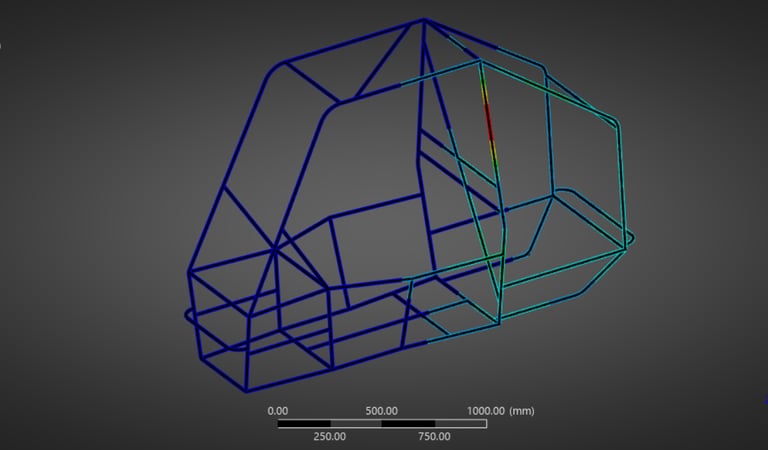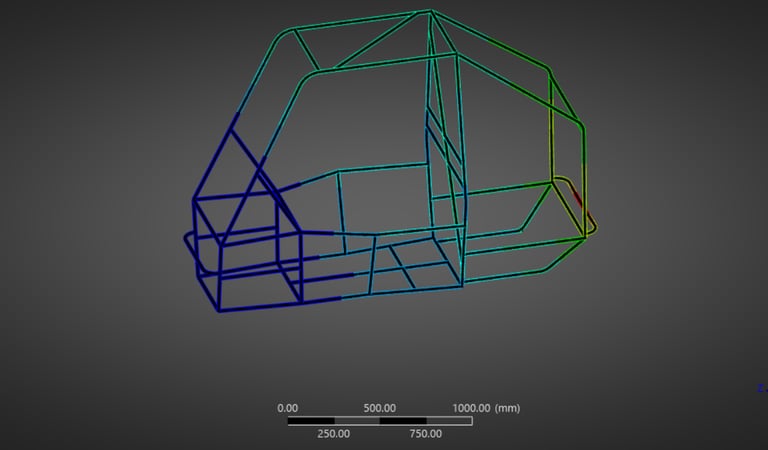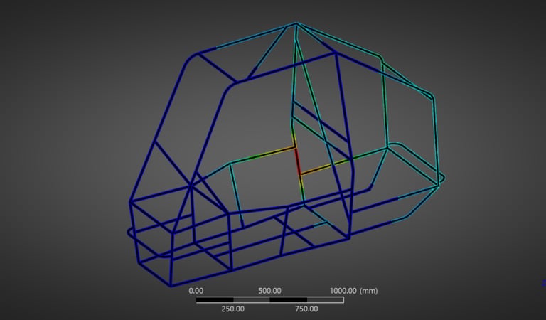 Reduced roll cage mass by 16.7% through iterative FEA while maintaining required safety margins under impact and rollover load cases.